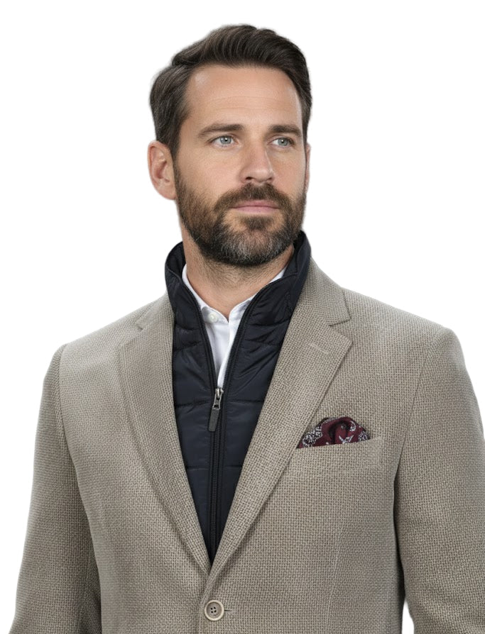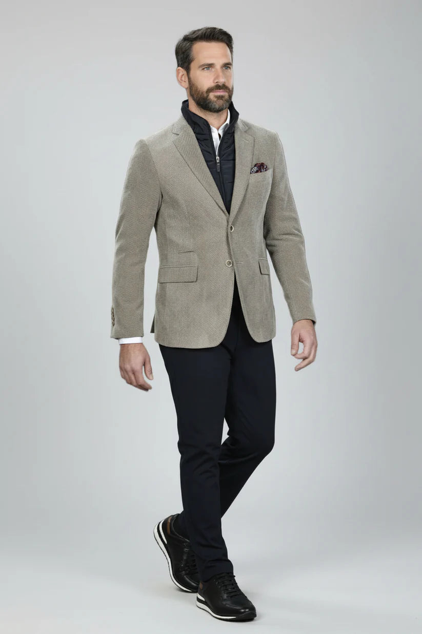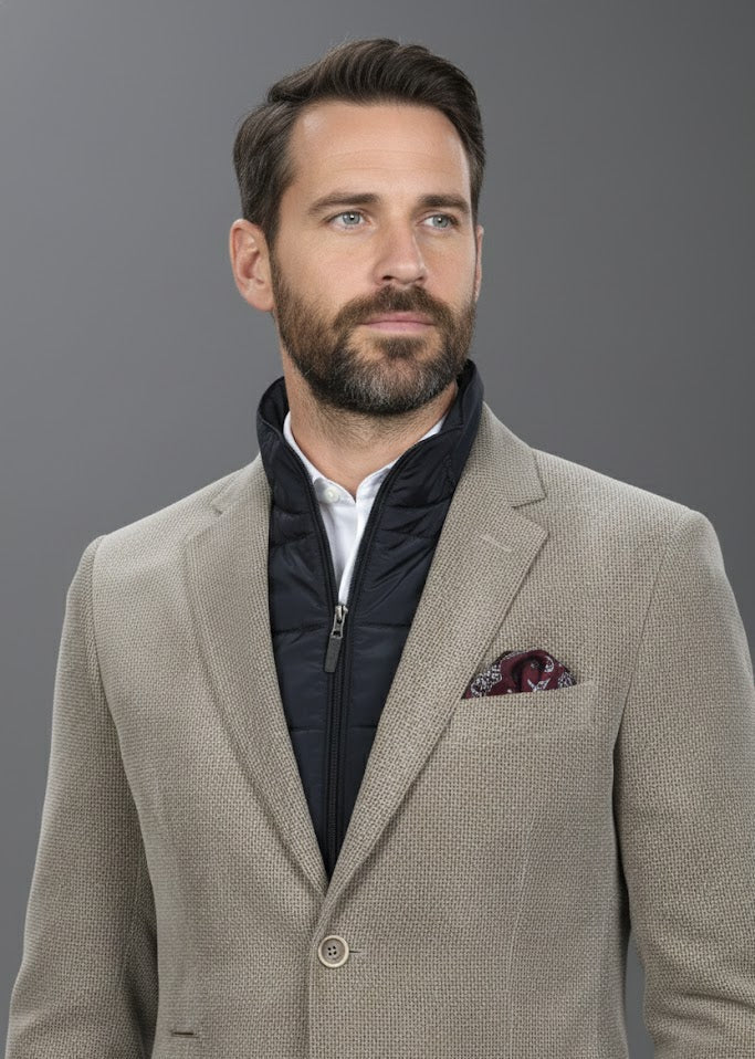 Diseño elegante con un toque funcional. Esta americana beige claro con textura espiga es perfecta para looks urbanos o de oficina. Incorpora un pecherín acolchado , que aporta calidez y un estilo moderno sin perder la esencia clásica.