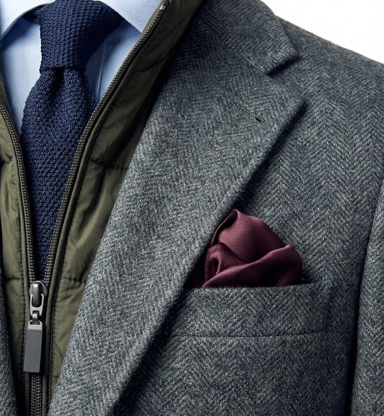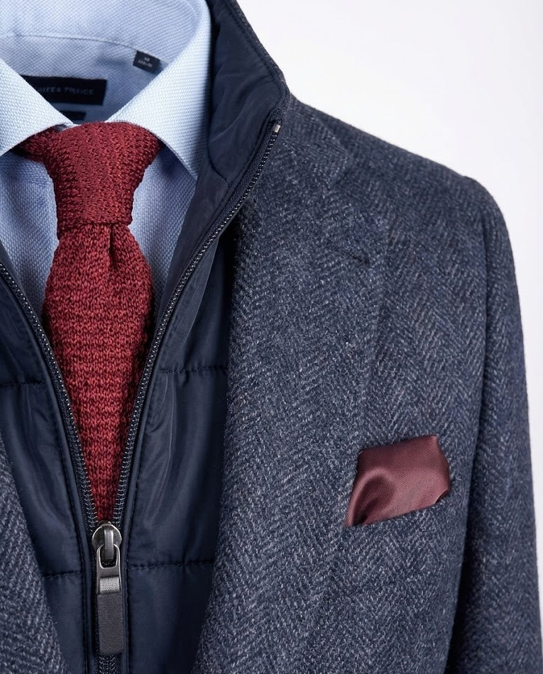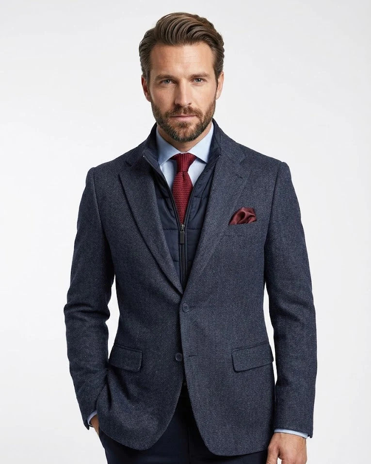 Presenta un cierre clásico de dos botones, doble abertura trasera para mayor movilidad y bolsillos con solapa, además del bolsillo en pecho con pañuelo burdeos decorativo. El tejido presenta una estructura en espiga de tono azul marino, que aporta textura y distinción a cualquier conjunto de oficina o eventos más sofisticados.