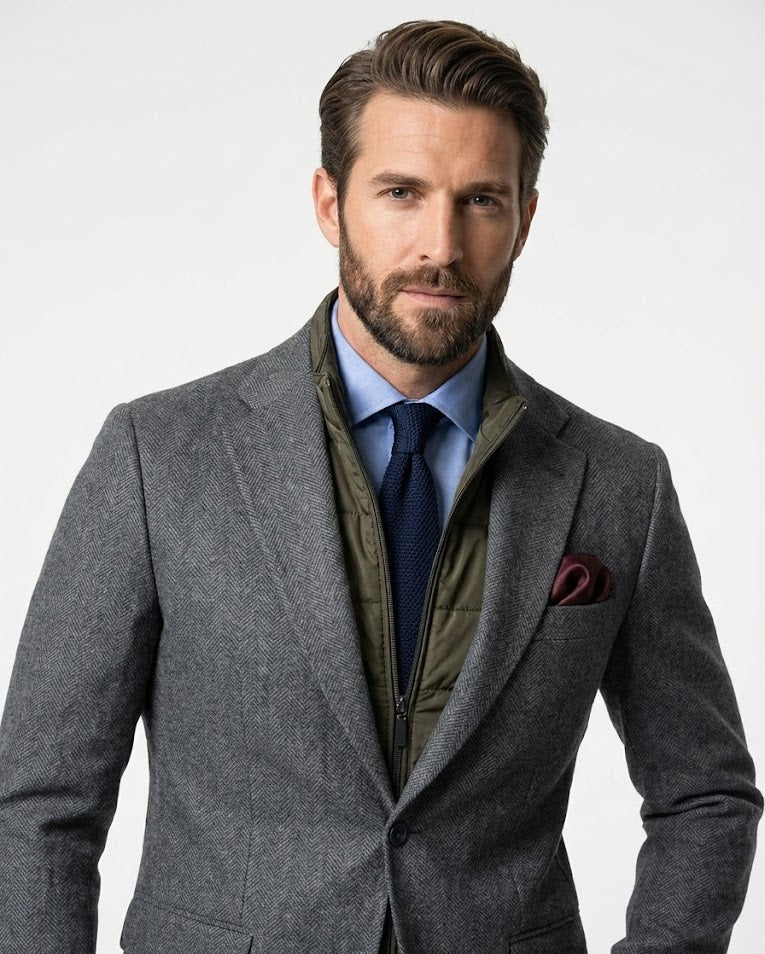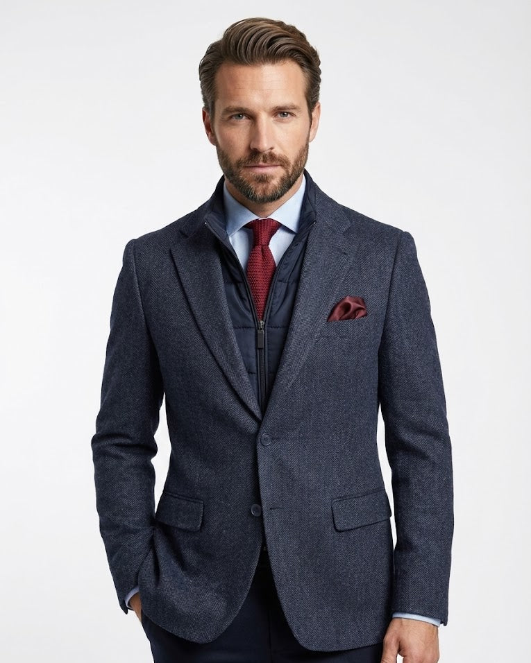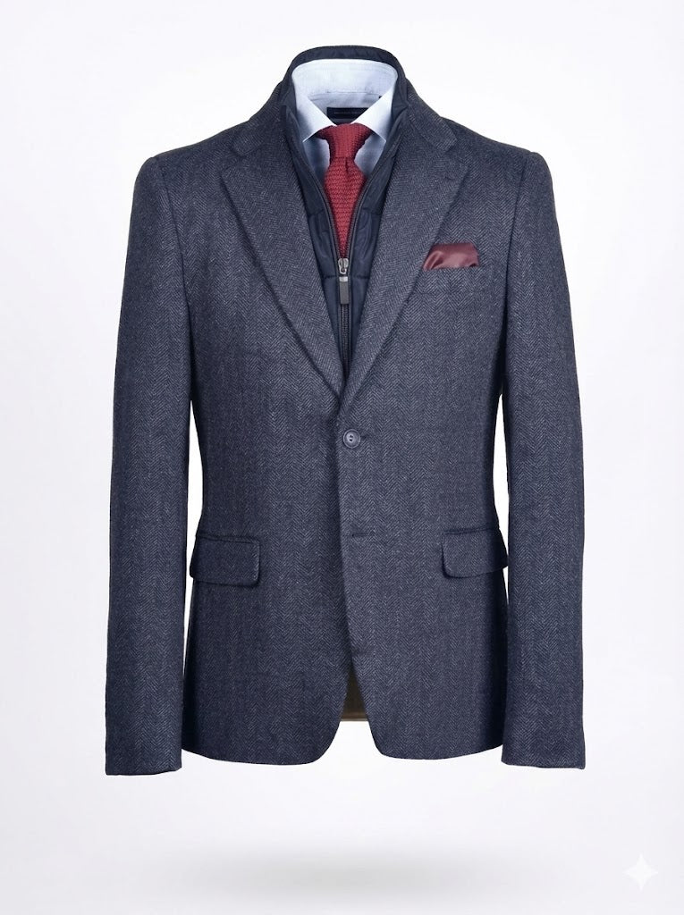 El pecherín acolchado con cremallera se puede quitar fácilmente, permitiendo adaptar la americana al clima y a diferentes estilos. Una prenda práctica y estilosa para el hombre moderno.