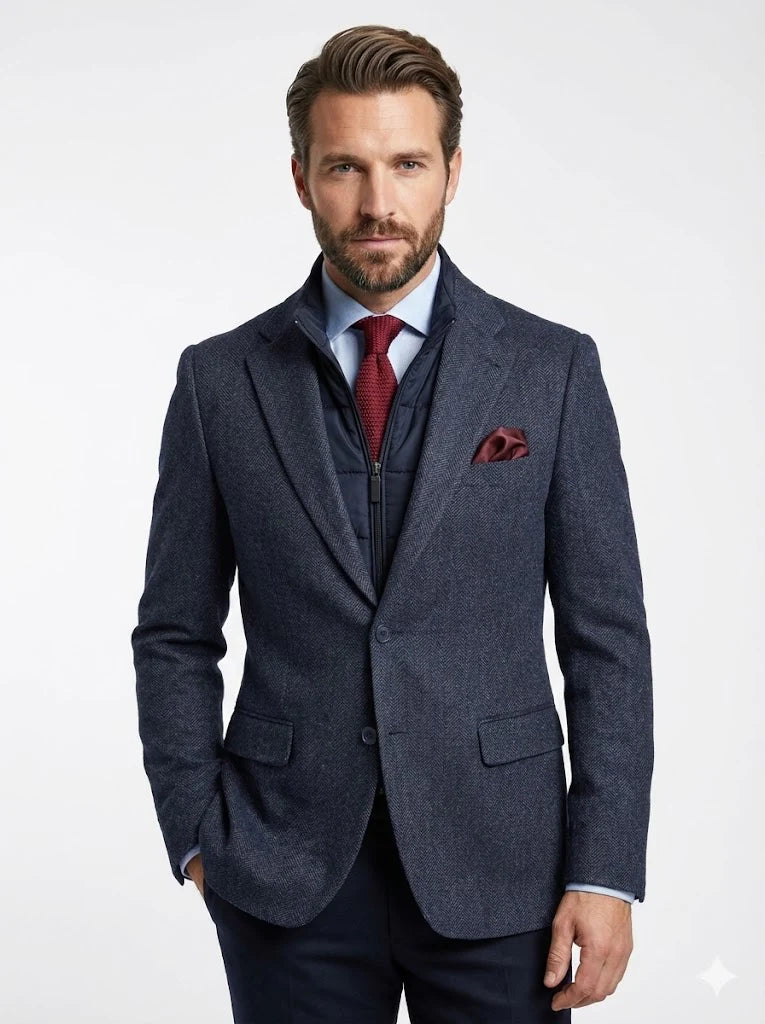 Americana de diseño semi-slim fit confeccionada en tejido de punto, perfecta para quienes buscan un look formal con un plus de confort y elasticidad. Esta prenda combina elegancia con funcionalidad, gracias a su pecherín interior acolchado y desmontable, ideal para proteger del frío sin renunciar a un estilo pulido.