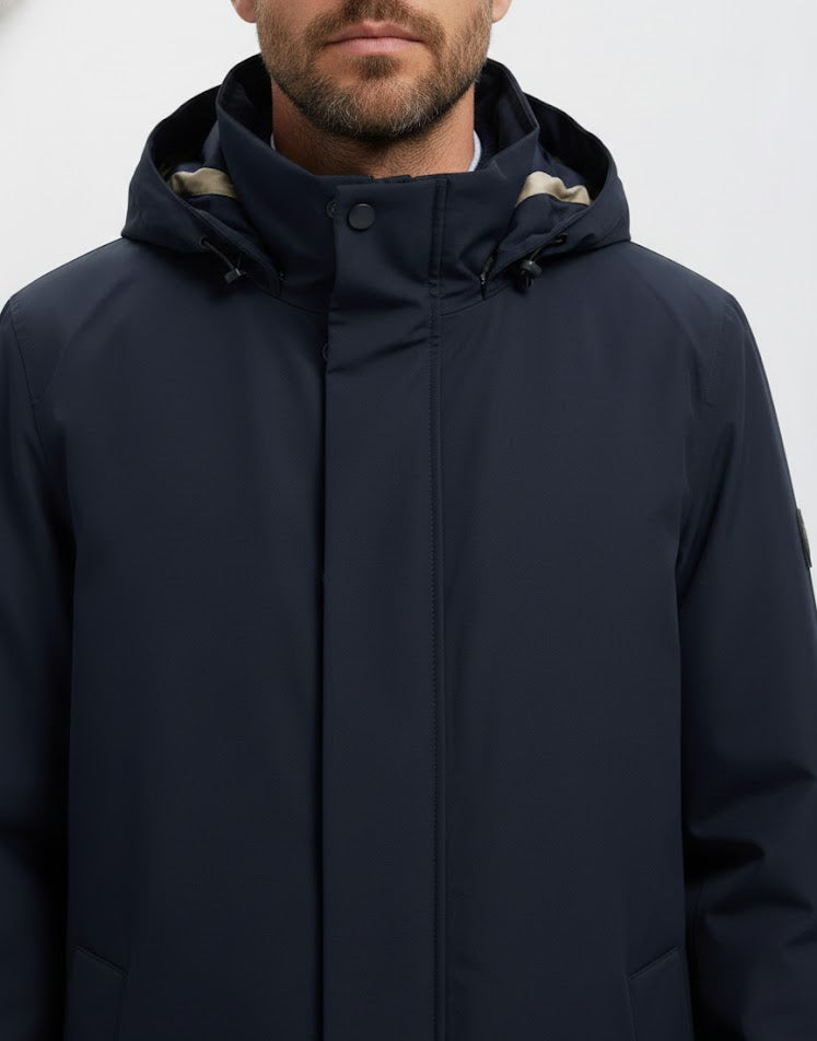 Su corte recto y la confección con materiales técnicos garantizan protección contra el viento y la lluvia sin renunciar a la comodidad. Perfecta tanto para looks urbanos como para llevar sobre trajes o conjuntos más formales.