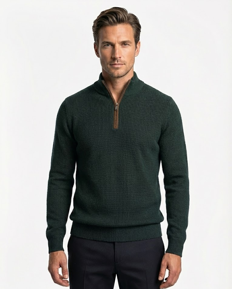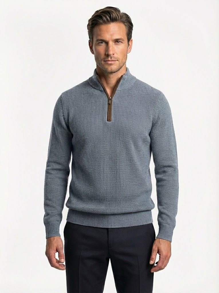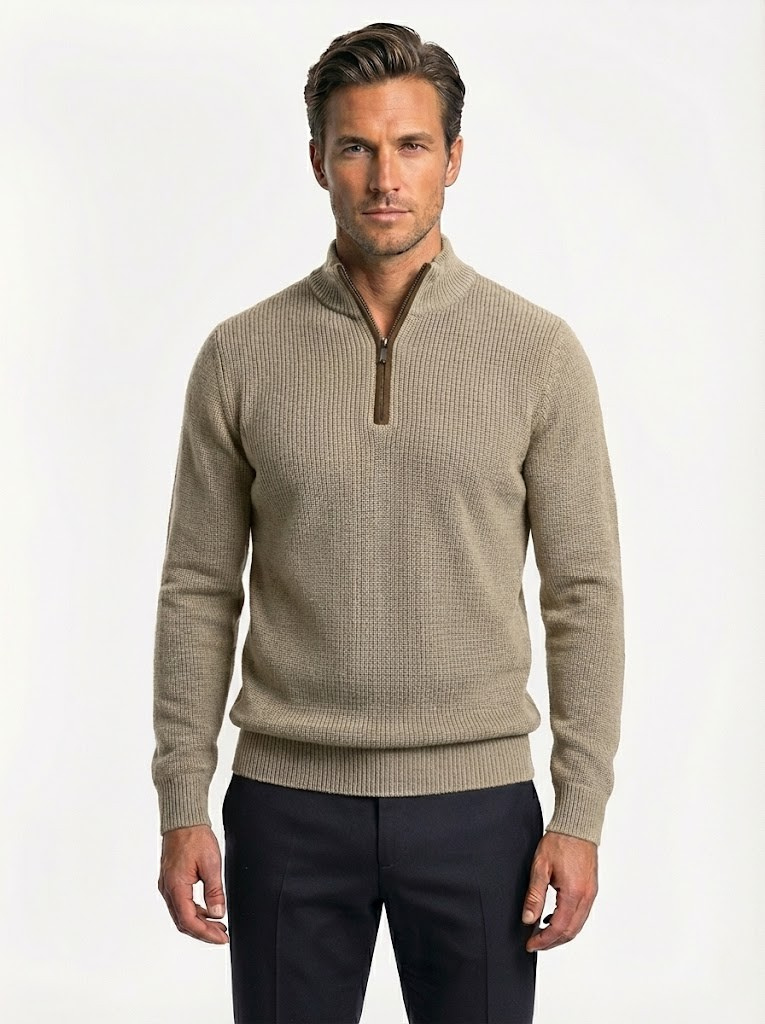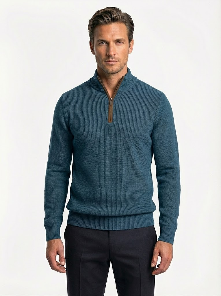 Un básico sofisticado que eleva cualquier look. Este jersey de punto presenta un diseño estructurado con textura acanalada y un cuello alto de canalé rematado con media cremallera metálica. Su corte clásico ofrece una silueta favorecedora sin renunciar a la comodidad.