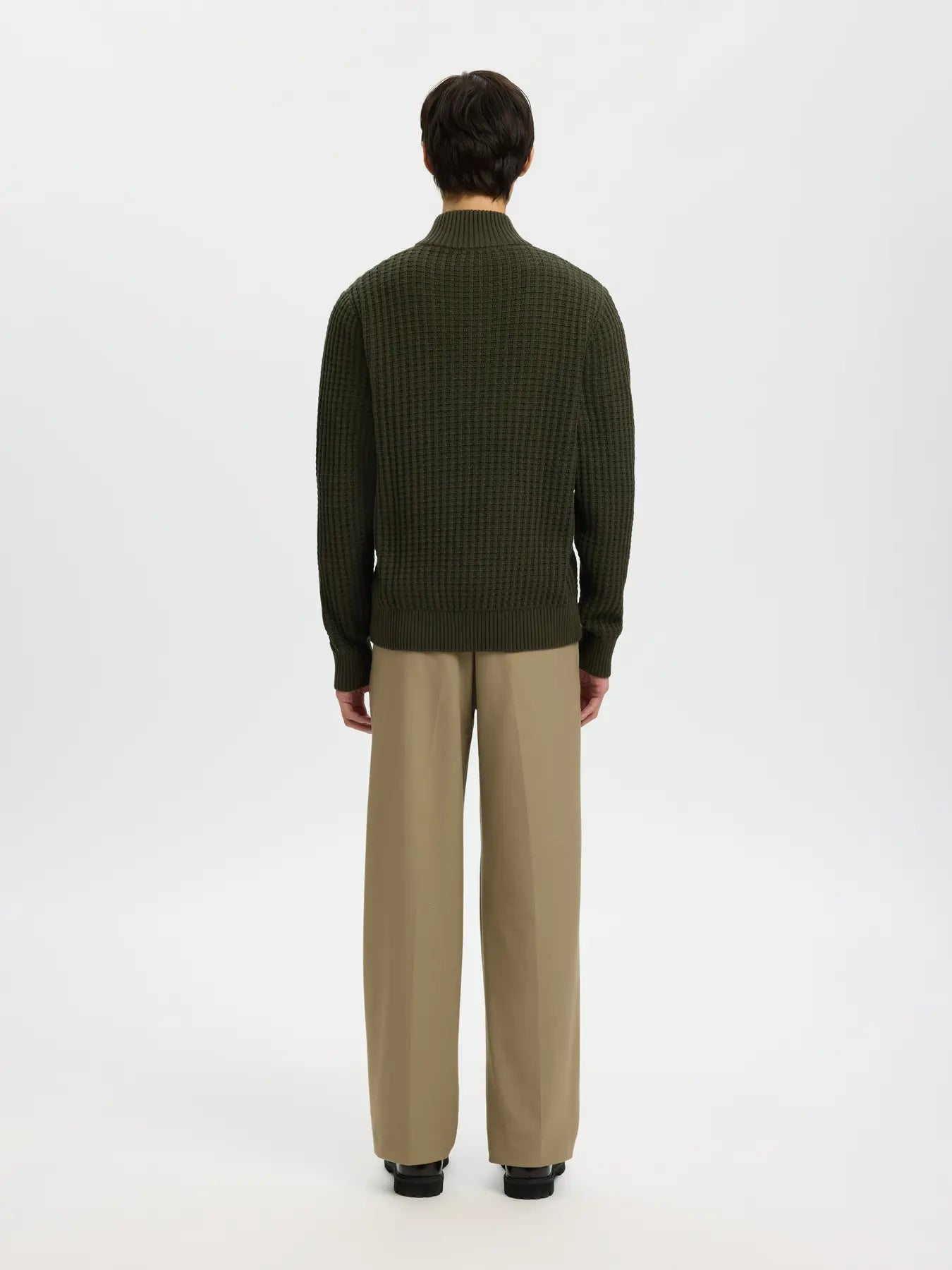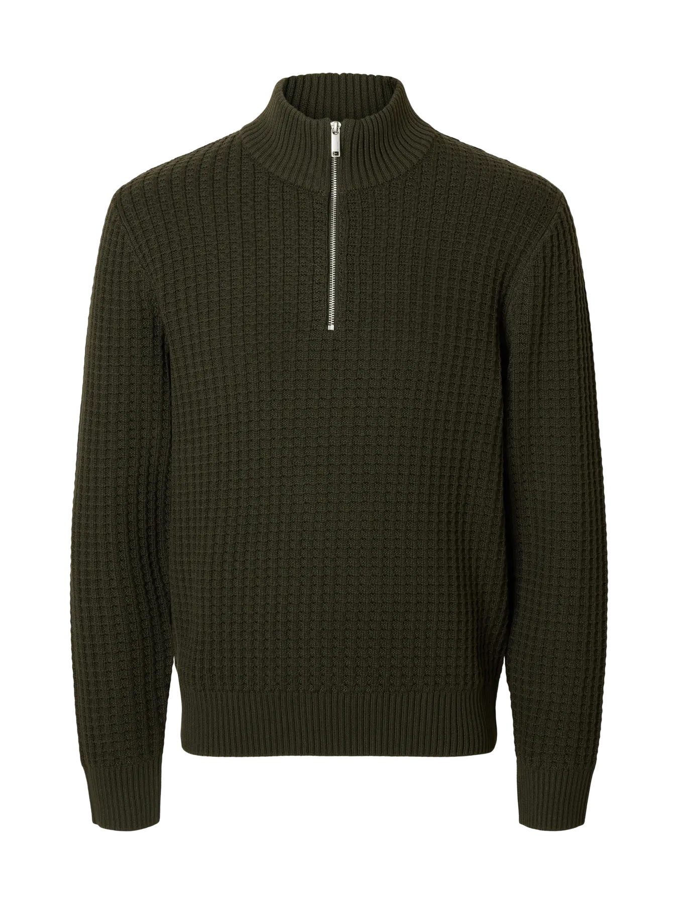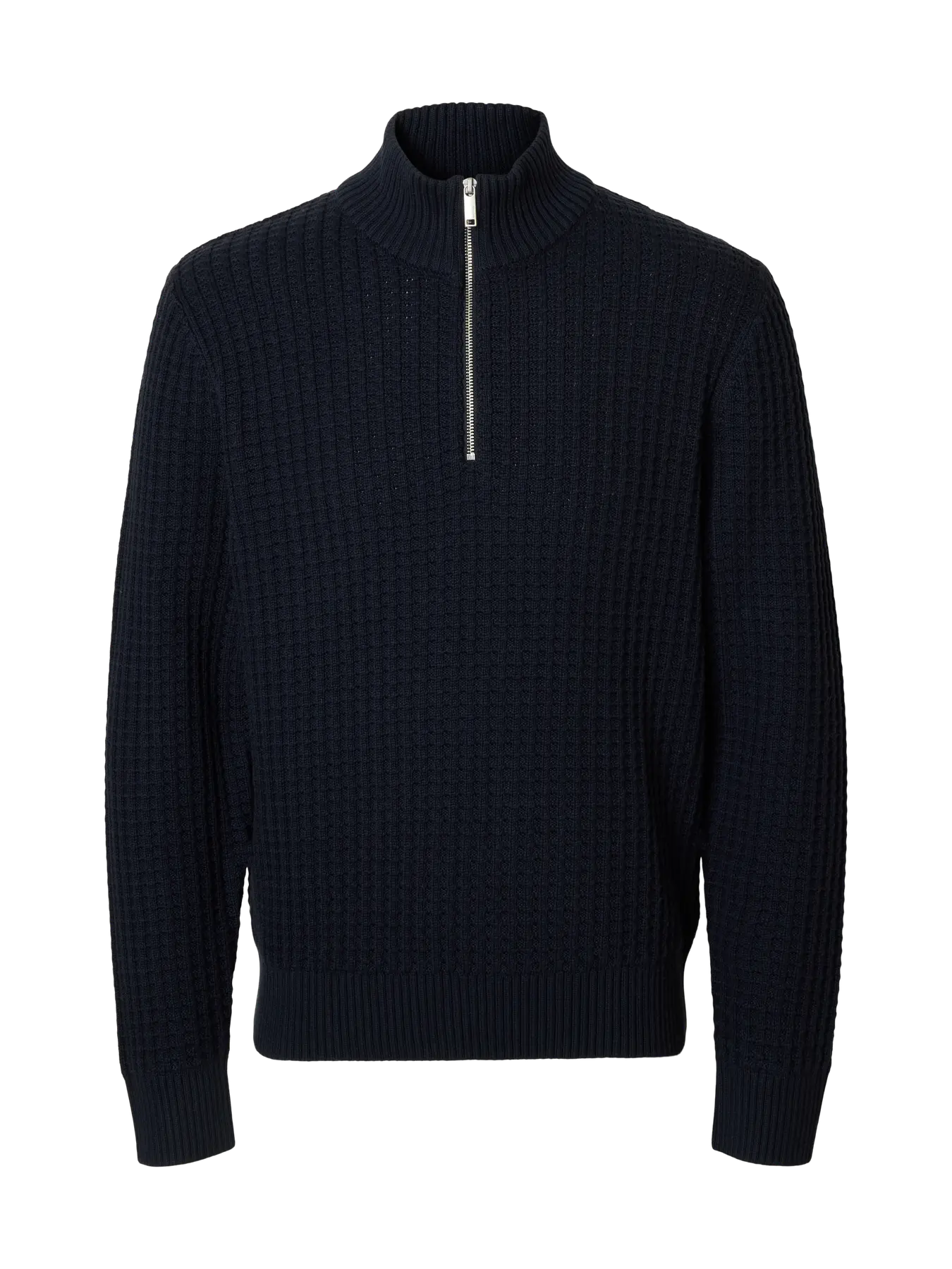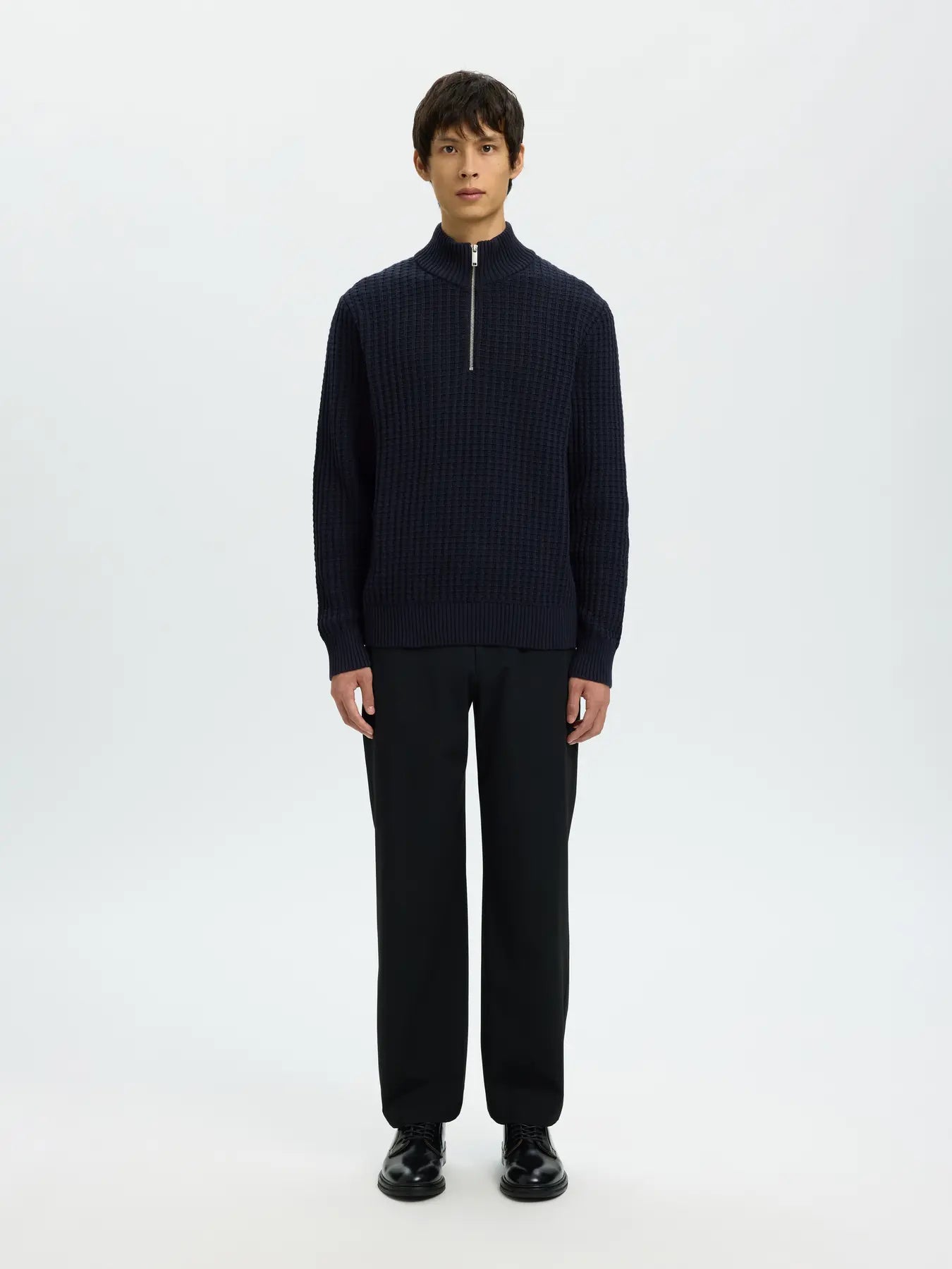 Diseño atemporal: Jersey de punto con cuello alto y cremallera parcial.