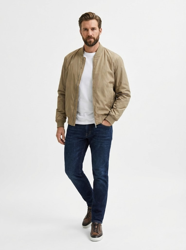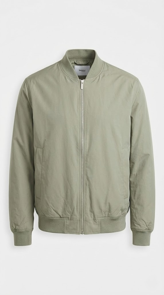 Corte Bomber Clásico: Diseño atemporal con cuello béisbol.